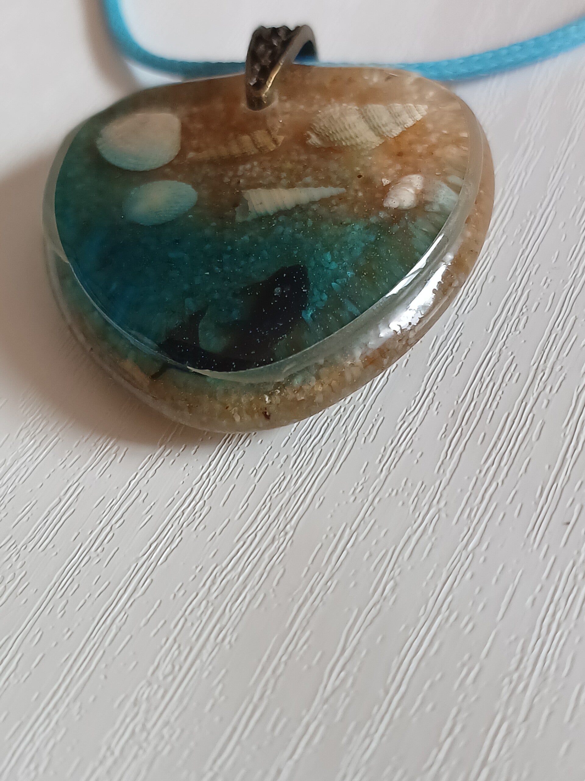 Colgante con arena y pieza naturales de mar que evocan una playa con agua tono turquesa.