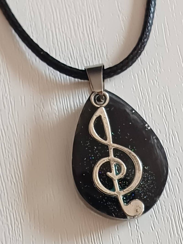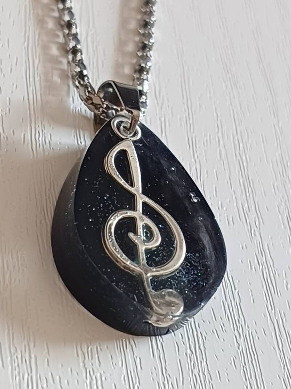 Precioso y elegante colgante en forma de gota. Fondo negro con polvo de brillo y clave de sol metálica encapsulada.