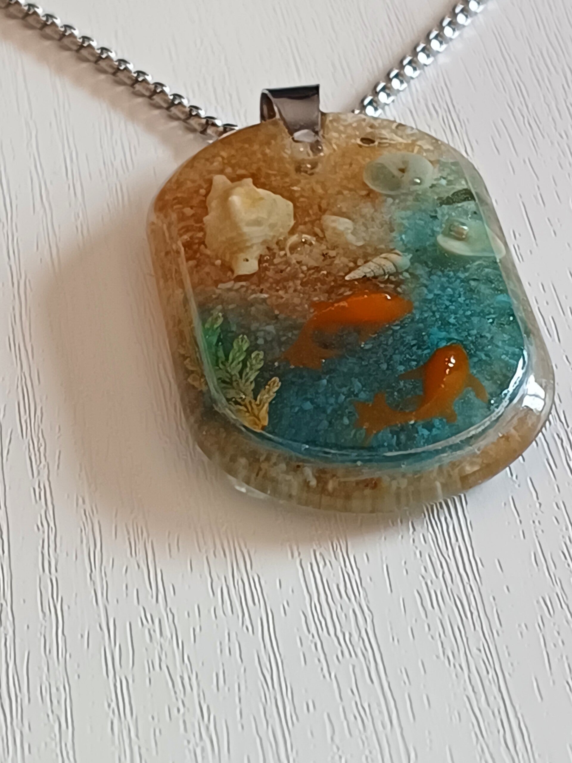 Colgante grande ovalado de arena con piezas marinas y dos pececillos anaranjados.