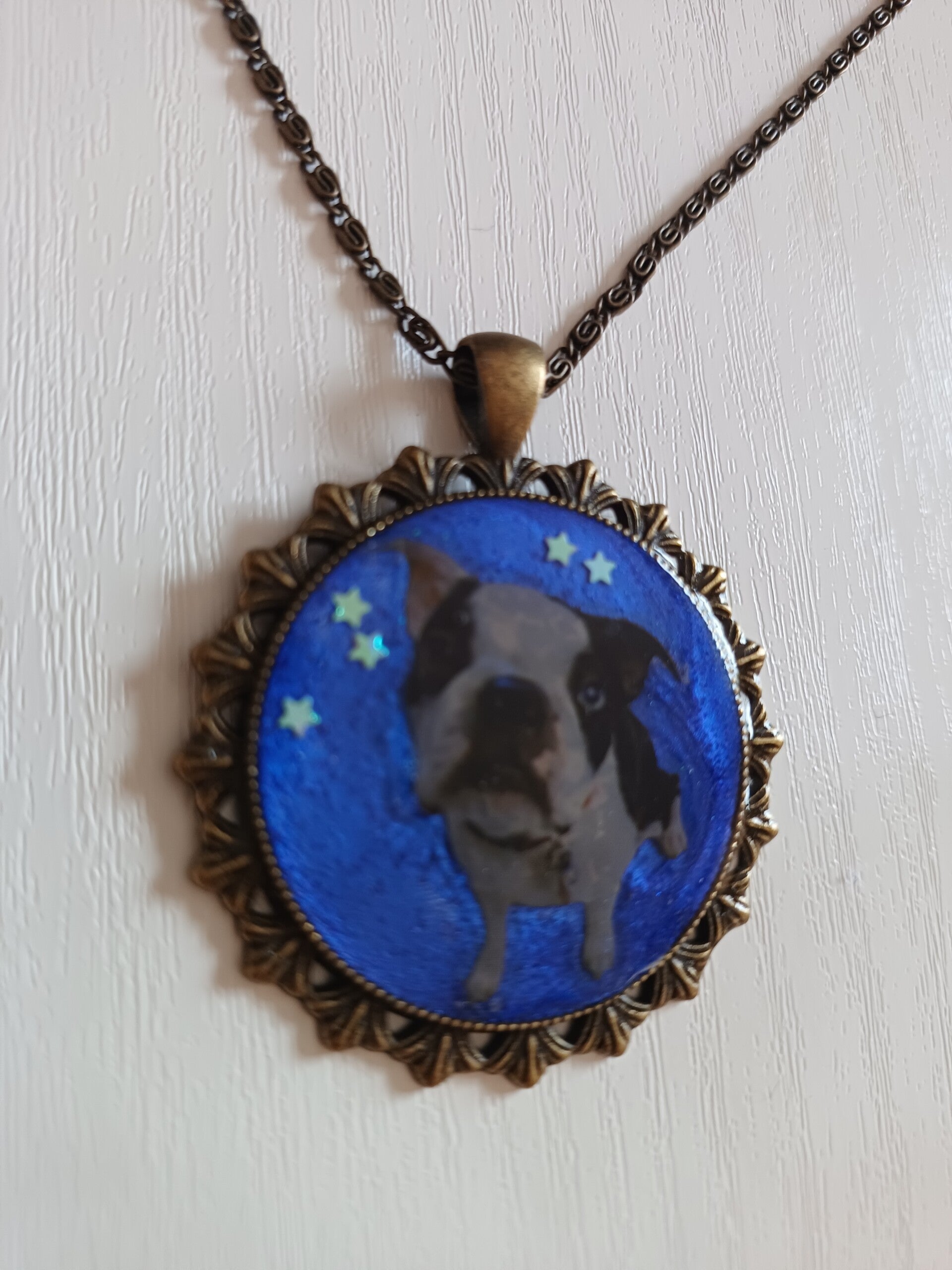 Colgante grande redondo aleación de metal color bronce. Fondo azul con divertido perrito curioso