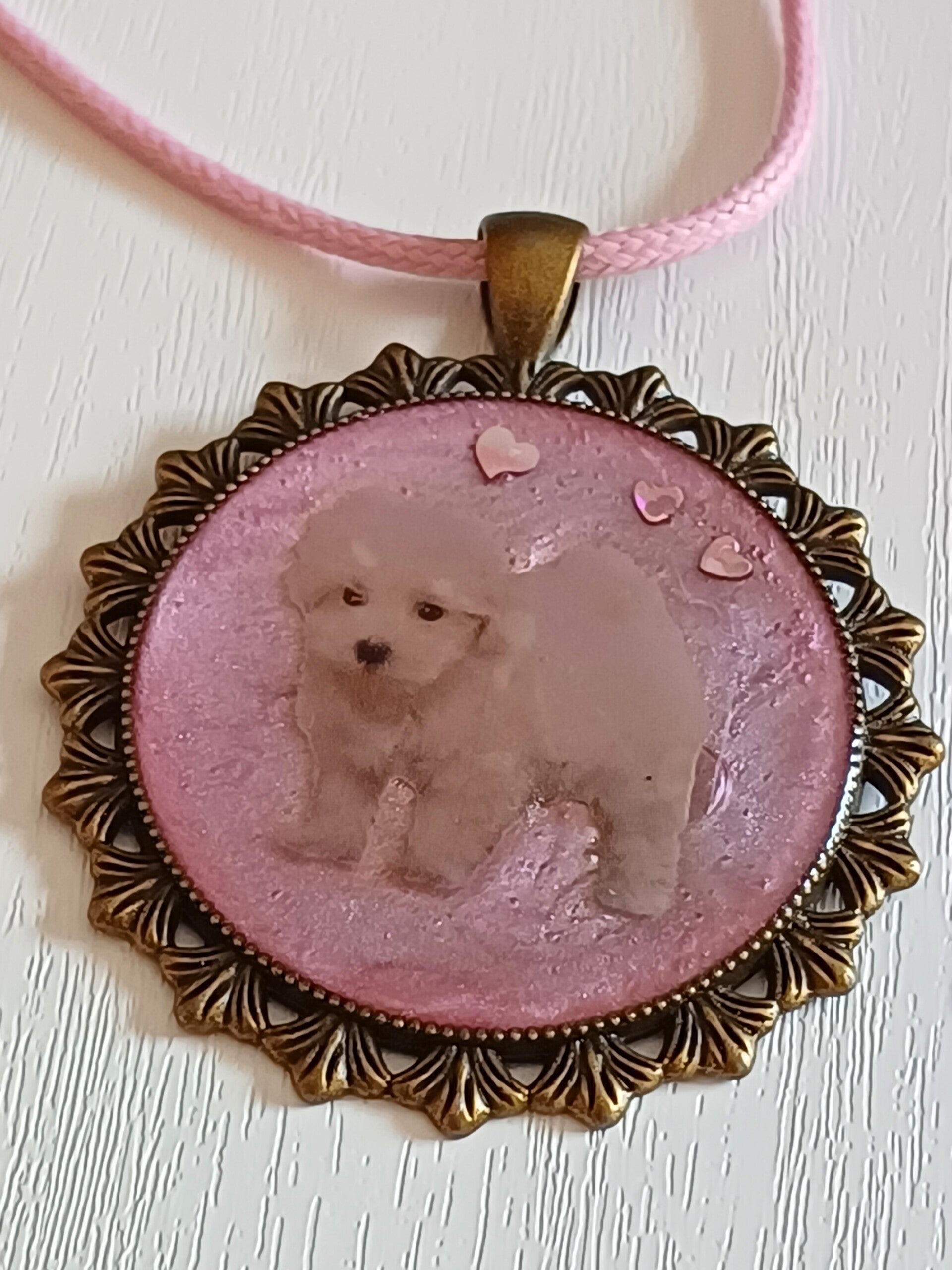Colgante metalico de aleación color bronce. Con adorable perrito blanco.