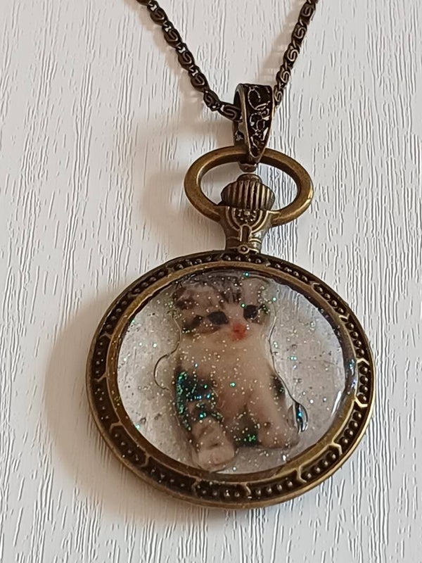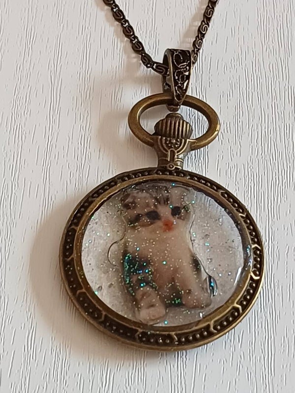 Precioso gatito en fondo transparente en marco metalico, forma de reloj, color bronce.