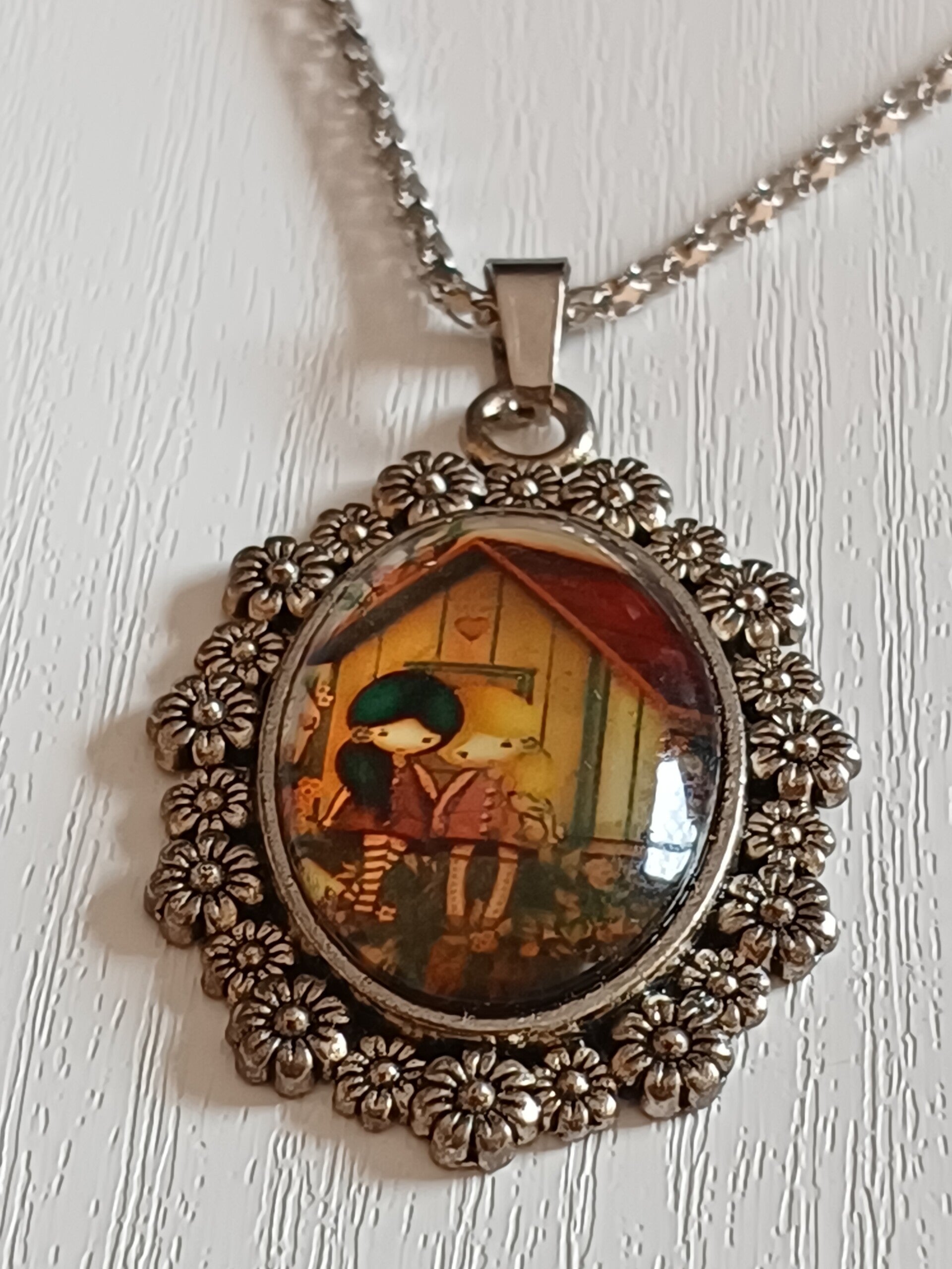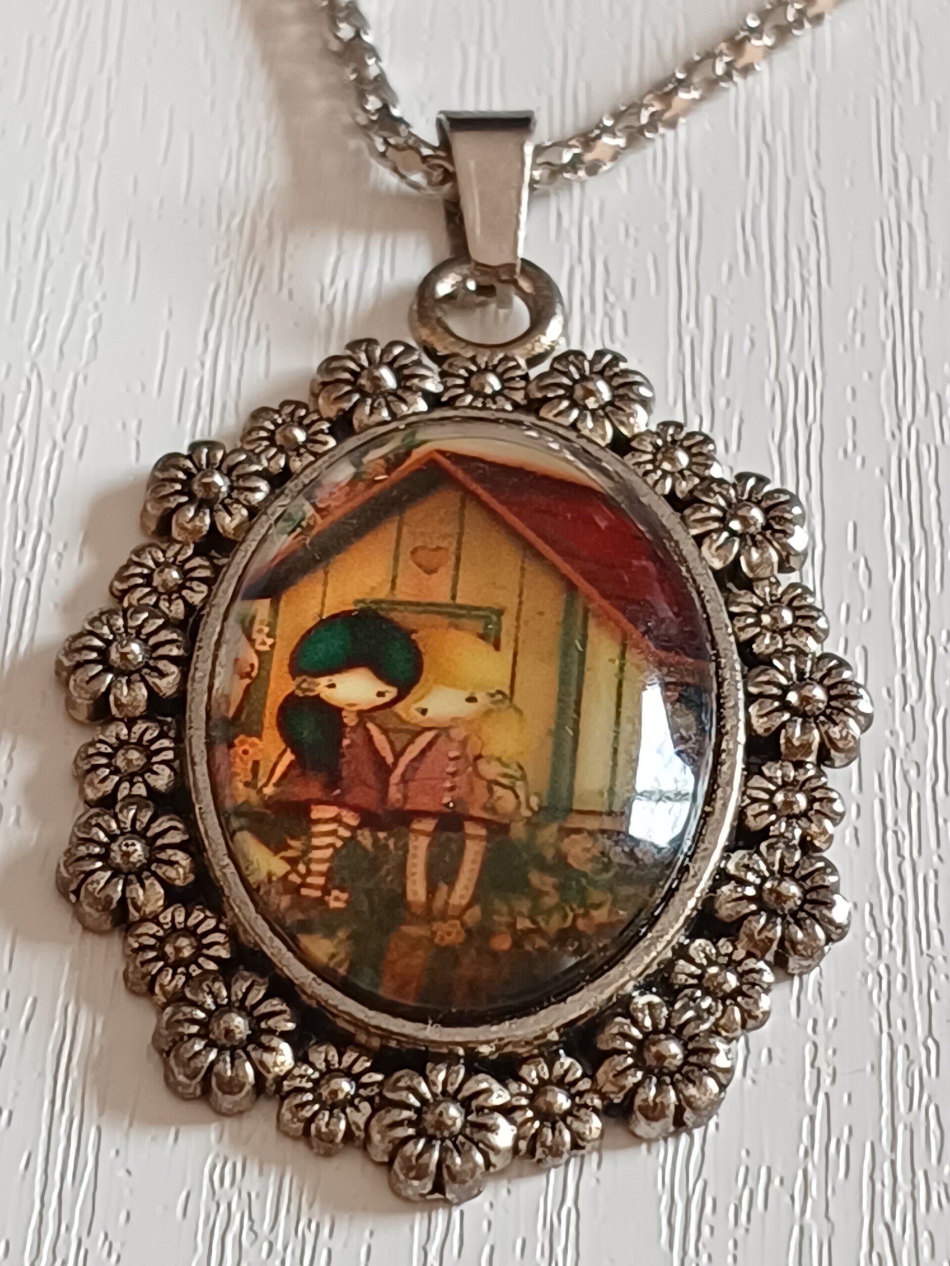 Colgante, vintage de metal color plata antigua. Con dulces niñas. Colores cálidos.